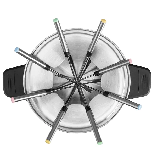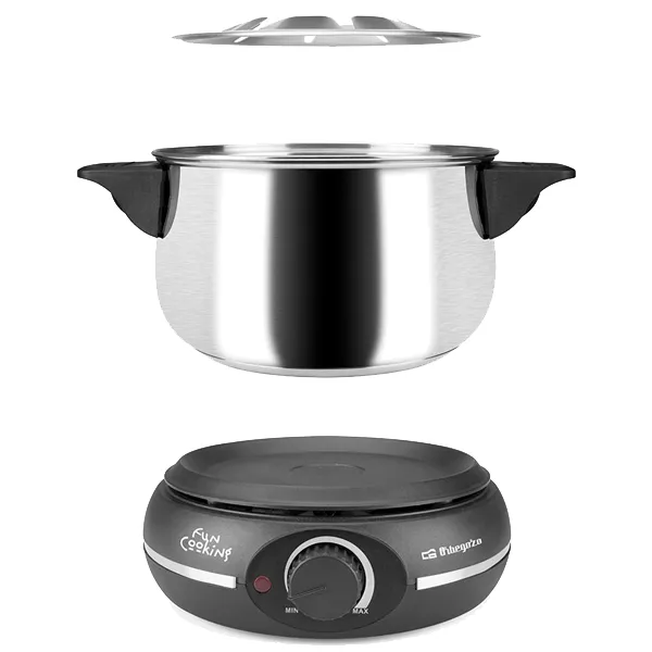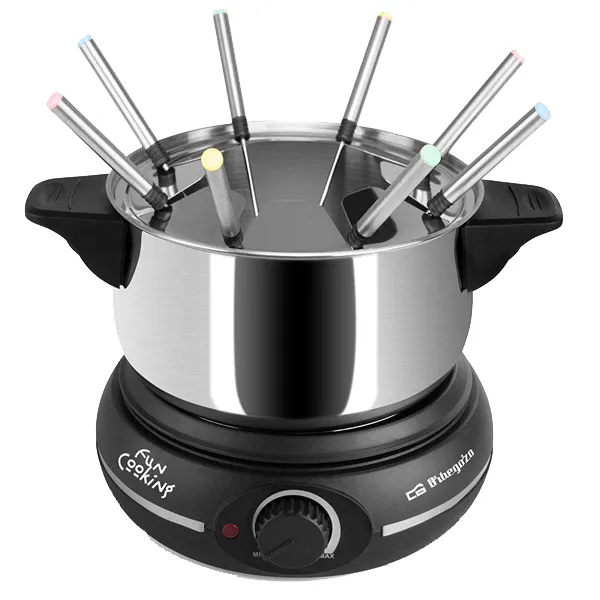 Potência: 1500WRecipiente destacável de aço inoxidávelCapacidade: 1,4ltsUso versátil: queijo, chocolate, carne…Botão de temperatura8 garfos de fondueTampa de proteção contra salpicosPega para fácil transportePés antiderrapantes