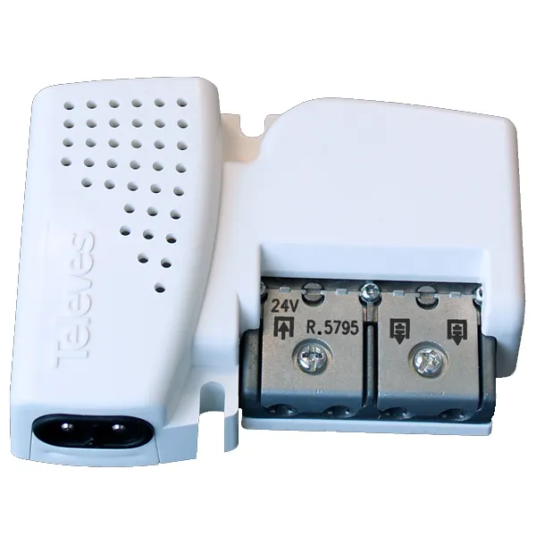 Fonte apartamento de 24V (130mA) que envia alimentação através do cabo coaxial de entrada, permitindo a passagem do sinal de TV. Intercala-se na instalação para alimentar amplificadores de mastro ou um sistema BOSS. Incorpora um repartidor para gerar duas saídas.