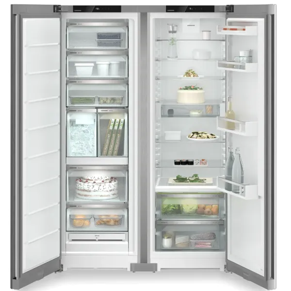 2 gavetas BioFresh-Safe em calhas telescópicas, 1 Fruit & Vegetable-Safe (fruta e vegetais), 1 Meat & Dairy-Safe (carne e laticínios)