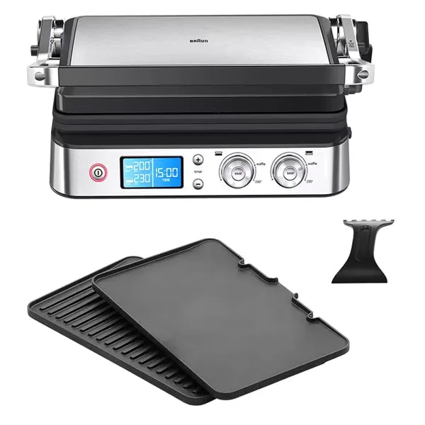 Conjunto de 1 placa ondulada e 1 placa lisa de alumínio antiderente removíveis, com regulação de temperatura independente e laváveis na máquina.