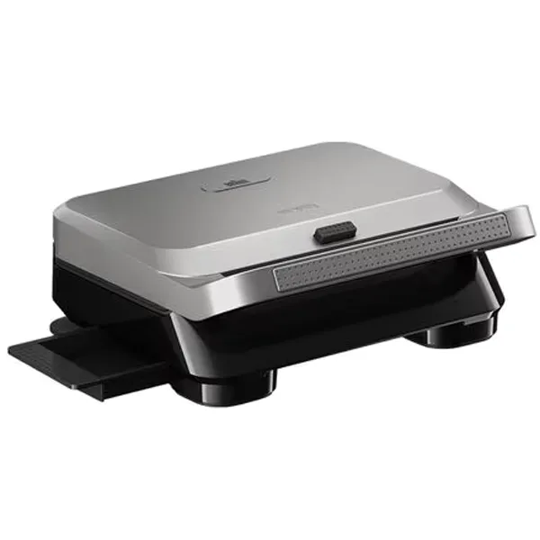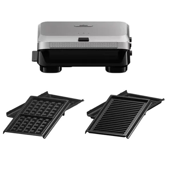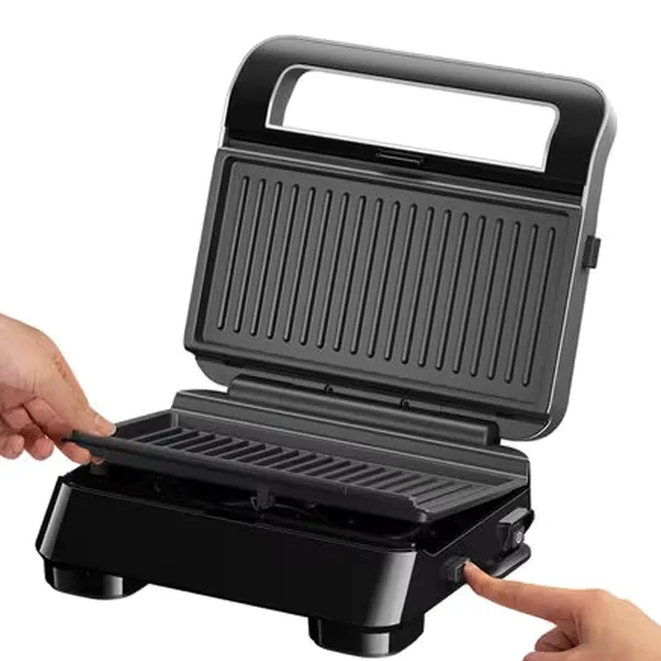 Potência: 800W. Placas onduladas amovíveis e anti-aderentes. Placas para Waffles. Bandeja recolhe gorduras. Interruptor ON/OFF. Sistema Bloqueio de segurança. Limpeza fácil.