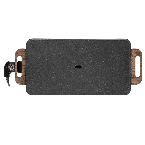 Superficie antiaderente e efeito cerâmico Termostato regulable. Superficie de asado: 50 x 27 cm. Recipiente para recolha de molhos e gorduras Fácil limpeza. Transportável para a mesa Pega de toque frio Potência: 2000 W. Conexão: 220-240 – 50/60 Hz.