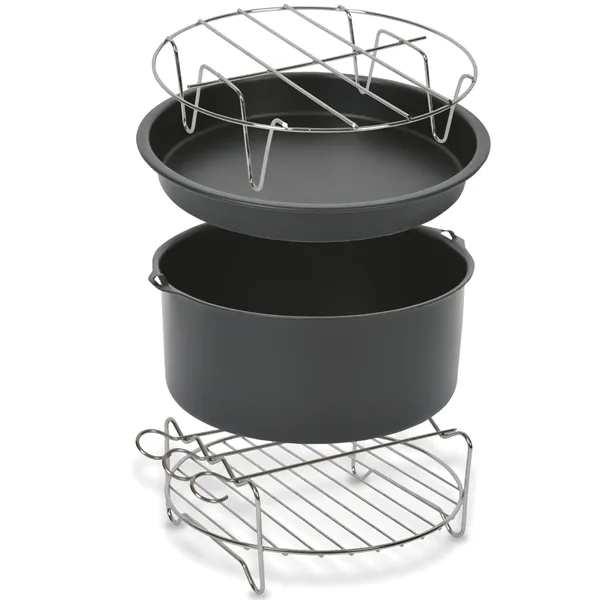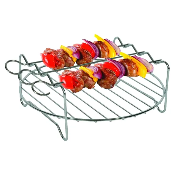4 acessórios: forma de bolos, placa de pizza, grelhados com espetos e suporte em metal