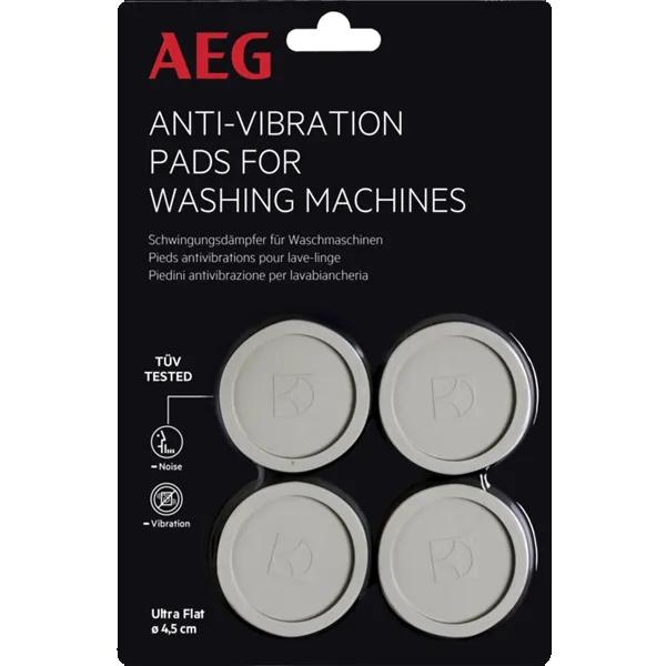 Almofadas anti vibratórias ultra planas de uso universal para limitar o ruído e as vibrações da máquina de lavar roupa ou da máquina de secar. Protegem o piso de eventuais riscos ou danos e mantém o eletrodoméstico firmemente no sítio. 6 mm de altura e 45 cm de diâmetro.
