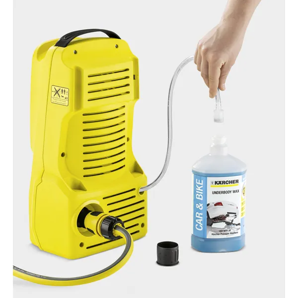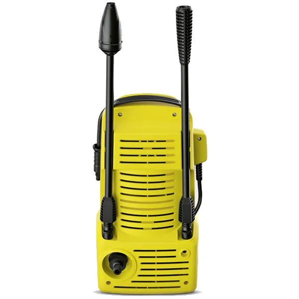 Acessórios: Mangueira de alta pressão de 4 m; Pistola de alta pressão, G 120 Q; Lança de jacto; Bico fresador; Tubo aspiração de detergente; Filtro de entrada de água em malha fina integrado; Adaptador para mangueira de jardim ¾”