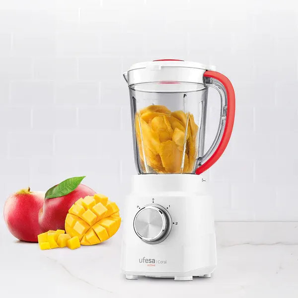 Jarro de plástico de 1,5L Tampa hermética com janela para introdução de ingredientes 2 velocidades + Turbo 4 lâminas de aço inoxidável adequadas para picar gelo Fecho de segurança. Potência: 600W
