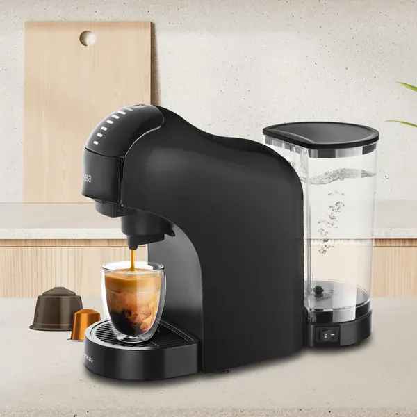 Painel de controlo tátil com 7 níveis Depósito de água amovível de 1L Compatível com cápsulas Nespresso, DELTA, Dolce Gusto e café moído Desligamento automático Design compacto Bomba de pressão de 15 bar 1400W