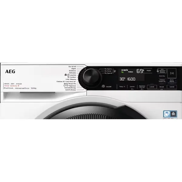 Funções: Ligar/Desligar, Temperatura, Centrifugação, Manchas, Termia em / Controlo remoto, Secagem Auto, Tempo de secagem, Modo lavagem, Mode secagem, Modo Vapor, Time Save, Pods, Início/Pausa