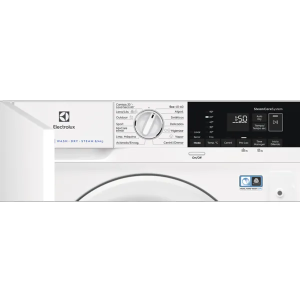 Funções: Ligar/Desligar, Modo, Seletor de temperatura, Centrifugação, Pré-lavagem, Time Manager, Tempo de secagem, Secagem auto, Início/Pausa, Início diferido
