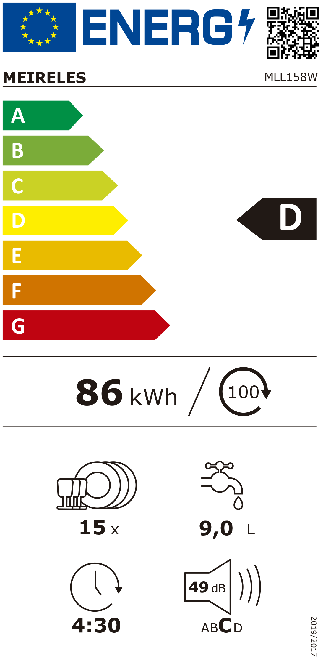 Eficiência Energética D 15 Talheres I.E.C. 6 programas Display LCD Meia carga Autodoor Bloqueio infantil Medidas 59,8 x 60 x 84,5 cm (larg. x prof. x alt.)