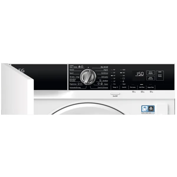 Funções: Ligar/Desligar, Seletor de temperatura, Centrifugação, Pré-lavagem, Soft Plus, Vapor Plus, Início diferido, Time Save, Início/Pausa