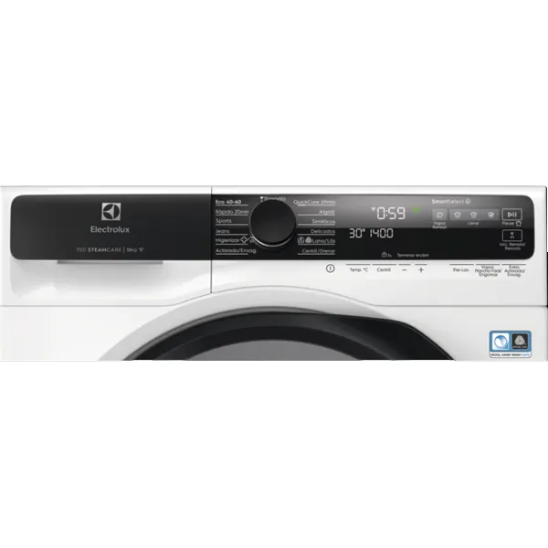 Programas de lavagem: QuickCare 59 min, Algodões, Sintéticos, Delicados, Lãs, Centrifugação / Drenagem, Enxaguamento, Hygiene, Jeans, Roupa de desporto, Rápido 20 min, Eco 40-60, 1 memória / 1 favorito