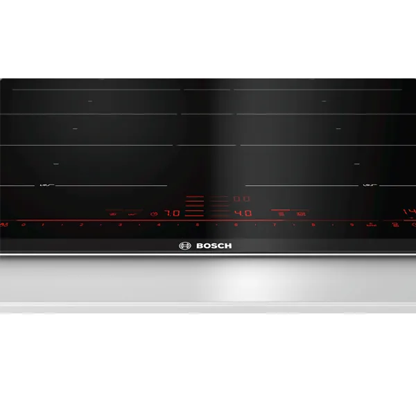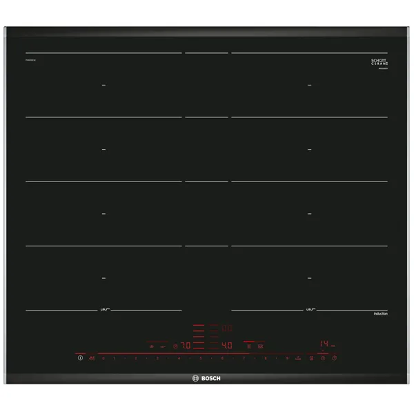 Zonas de cozedura de indução: 1 zona de Ø 230 mm, 2.2 kW (potência máx. 3.7 kW); 1 zona de 380 mm x 230 mm, 3.3 kW (potência máx. 3.7 kW) ou 2 zonas de Ø 190 mm, 2.2 kW (potência máx. 3.7 kW)