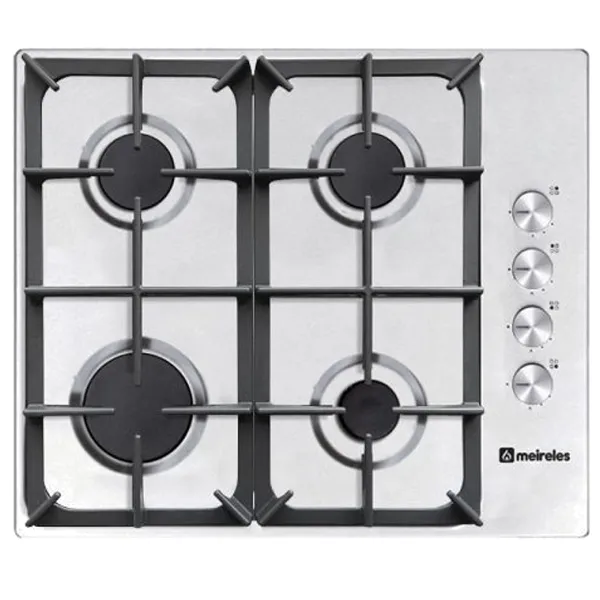 Placa a gás com 60cm Aço inoxidável 4 queimadores a gás Acendimento electrónico Válvulas de segurança Manípulos laterais Grelhas em ferro fundido Dimensões (axlxp): 30x585x500mm
