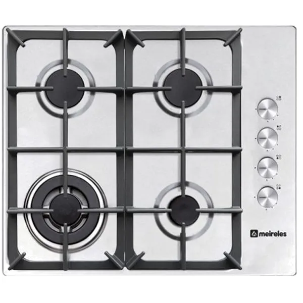 Placa a gás com 60cm Aço inoxidável 4 queimadores a gás Queimador Wok Acendimento electrónico Válvulas de segurança Manípulos laterais Grelhas em ferro fundido Dimensões (axlxp): 30x585x500mm