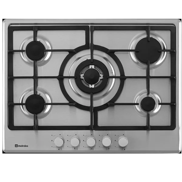 Placa a gás com 70cm Aço inoxidável 5 queimadores a gás Queimador Wok Acendimento electrónico Válvulas de segurança Manípulos frontais Grelhas em ferro fundido Preparada para gás butano/propano