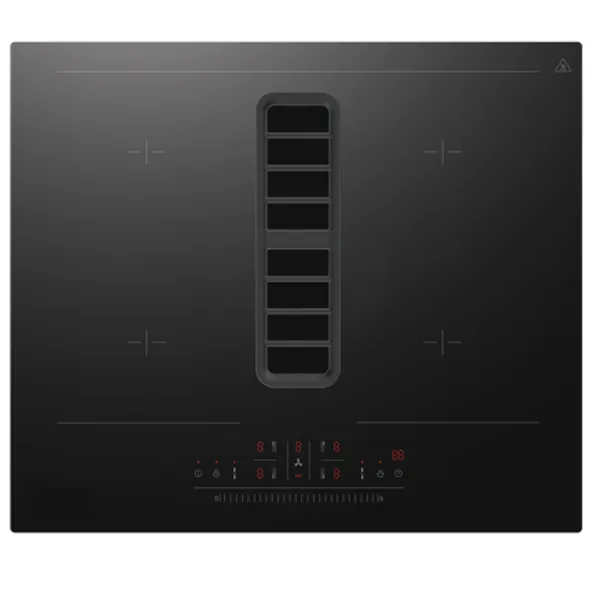 Placa vitrocerâmica de indução de 60cm Com exaustor integrado Motor BLDC Inverter Extracção 560 m3/h Touch control slider 2 Zonas flexíveis (37x20cm / 3600W) Programador Plug & Play Classe A++