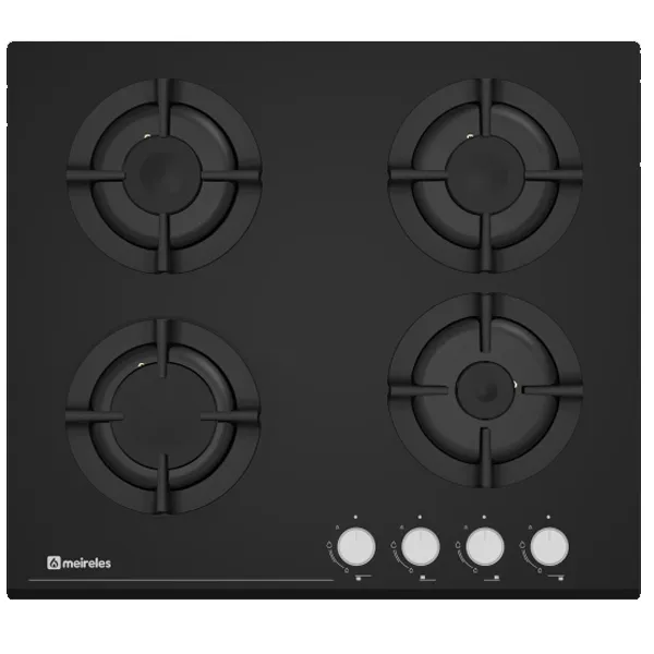 Placa cristal gás com 60cm 4 queimadores a gás Acendimento electrónico Válvulas de segurança Manípulos frontais Grelhas em ferro fundido Dimensões (lxp) 590x520mm