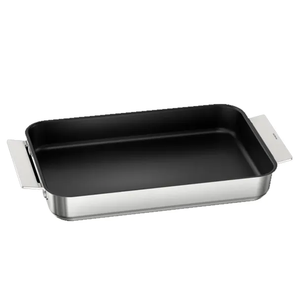 Tabuleiro para zona flexível, tamanho grande: 45 x 26 cm (parte superior incluindo pegas) / 35 x 22 cm (parte inferior) Compatível com indução Apto para o forno até aos 220°C Com 3 camadas de revestimento antiaderente Revestimento sem PFOA