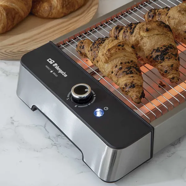 6 posições de tostagem Permite tostar qualquer tipo de pão Botão de ligar/desligar Bandeja recolhe migalhas Temporizador com sinal acustico Recolhe cabos. Potencia: 600 W. Corpo em aço inox Dimensões: 42 x 30,6 x 9,2 cm Tensão: 230 V – 50 Hz.