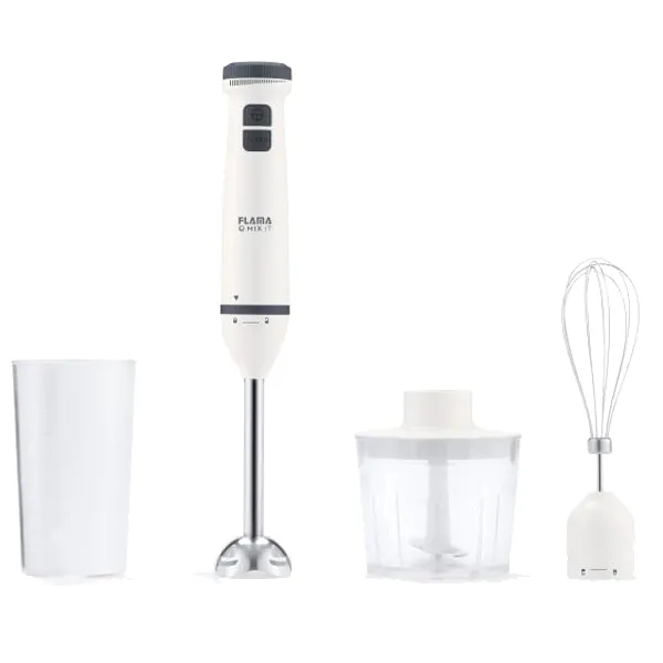 Cor: BrancoPotência máxima: 800WVelocidades: 2Função TurboRegulador de potênciaLâminas: 2 lâminas em aço inoxPé metálico desmontávelAcessórios: Batedor, picadora e copo com tampa